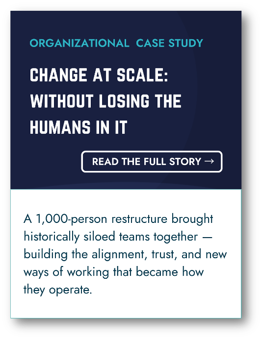 Whether you’re focused on your own growth, your team’s performance, or guiding your organization through transformation, we’ve built our work around the 3 places leaders most need support: